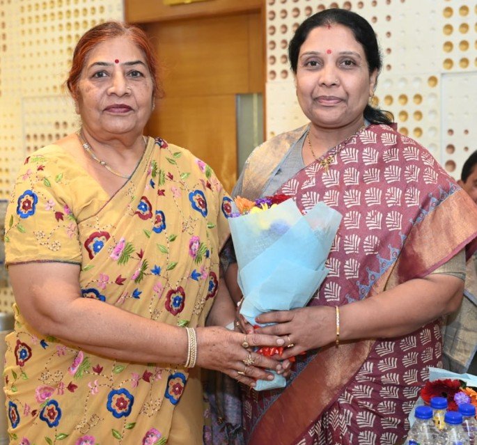 श्रीमती प्रतिभा बेन जैन (महापौर- मेयरश्री अहमदाबाद) का गुलदस्ते से स्वागत करती हुई। श्रीमती वंदना तापड़िया (मारूति कार्गो ग्रुप अहमदाबाद)