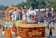 गांधीनगर। 77वें गणतंत्र पर्व के उपलक्ष्य में नई दिल्ली के कर्तव्य पथ पर आयोजित परेड में गुजरात की झाँकी को लगातार चौथी बार ‘पॉपुलर चॉइस श्रेणी’ में प्रथम स्थान प्राप्त करने के लिए शुक्रवार को विधिवत् रूप से ट्रॉफी एवं पुरस्कार प्रदान किए गए हैं।
